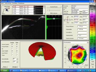 Mit der Pentacam kann nicht nur die Pachymetrie (Dicke der Horhaut) und eine Topometrie (Darstellung der Hornhautoberfläche) gemessen werden, auch ein optischer Schnitt durch das Auge (Scheimpflugkamera) ist möglich. Eine Darstellung der Oberfläche der Hornhaut dient unter anderem zur Anpassung spezieller Kontaktlinsen (Z.B. Keratoconus) ohne Topometrie und Pachymetrie lässt sich die Frage nach der Möglichkeit von refraktiven Eingriffen mit LASER wie z.B. LASIK nicht beantworten (wenn die Hornhaut zu dünn ist, geht's nicht). --> mehr dazu