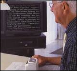 Bildschirmlesegeräte (Fernsehlesegeräte) z.B."MAXLUPE", die elektronische Leselupe MAXLUPE ermöglicht das Lesen und Schreiben von Texten und das Betrachten von farbigen Bildern. Eine Kamera nimmt eine Text- oder Bildvorlage auf und stellt diese auf einem Bildschirm vergrössert dar. Die stufenlos regelbare Vergrößerung (4- bis 20-fach) sorgt für eine variable Vergrößerung, die sich den Bedürfnissen der Augen optimal anpasst. |